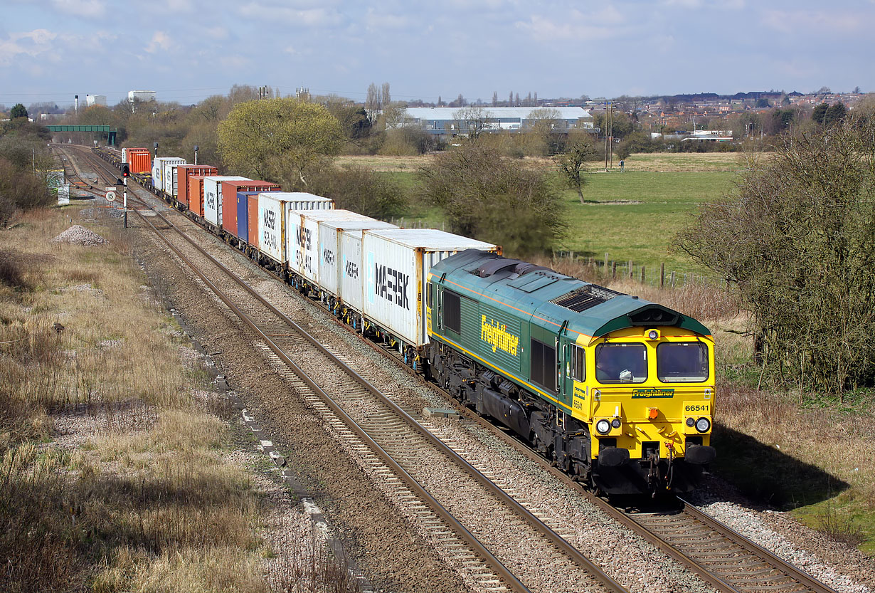 With the houses and factories of Melton Mowbray forming the background, 66541 passes Brentingby on 31 March 2016 with the 4L93 10:08 Lawley Street to Felixstowe North freightliner. The clouds in the background are a hint of what was to come - the Met Office having been a bit optimistic yet again! |