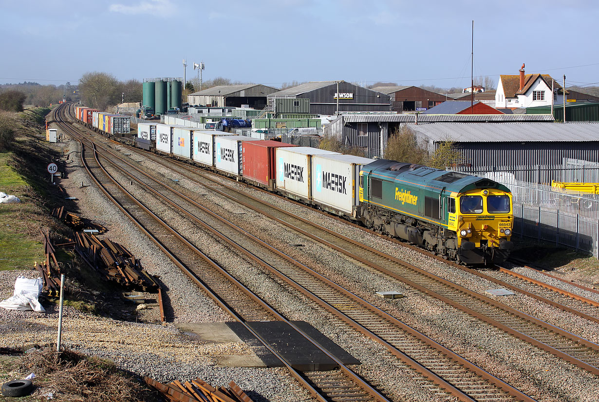 66543 diverges onto the up relief line at Challow on 27 February 2014 with the 4L31 09:03 Bristol to Felixstowe North freightliner. Always worth a picture, although not as interesting as the traction that could be seen on a freightliner at this spot two decades previously! |