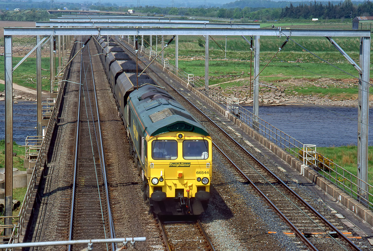 66544 crosses the River Esk at Metal Bridge with the 6Z39 11:16 New Cumnock to Drax Freightliner coal hoppers on 17 May 2002. As both the A74 road and the railway cross the river here, it doesn't take much imagination to work out what the local pub (and therefore the locality) is named after! Although sunny, it was an extremley blustery day, and with virtually nothing to lessen the full force of the wind coming in off the Irish Sea, an exposed footbridge was not the best place to spend any length of time! |
