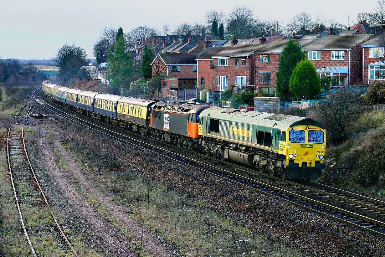 Certainly not the picture I was hoping for, although I suppose it is definitely different. When 56106 had problems near Barrow Hill on 27 December 2003, whilst working the Pathfinder Tours 1Z73 07:20 Crewe to Carlisle 'Settle & Carlisle Circular 1' railtour, 66560 was sent to assist, taking the train on to Calder Bridge Junction, Wakefield. Here 56078 took over, working the train for the rest of the day. So here is the Fred / Grid combination pictured passing Kilnhurst in awful light, running an hour late. |