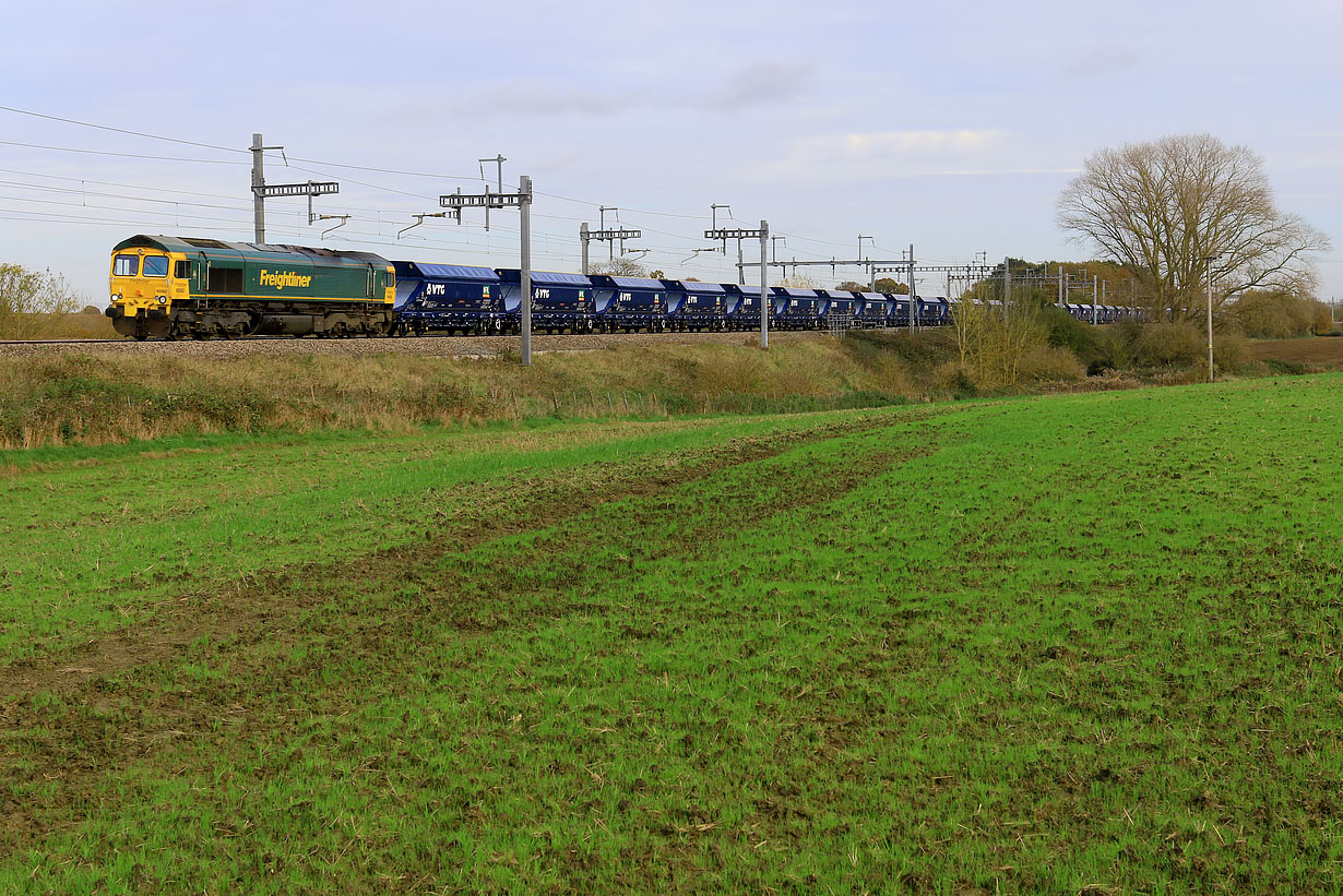 66562 passes Uffington on 11 November 2024 with the diverted 6V31 08:35 Wembley Receptions 1-7 to Whatley Quarry stone empties. The train consists of 34 brand new VTG HOA wagons, which had travelled from Poland via the Channel Tunnel. They had moved from Dollands Moor to Wembley only a few hours earlier. With only a few hours in the country, the wagons have yet to encounter the vandal's paint spray! |