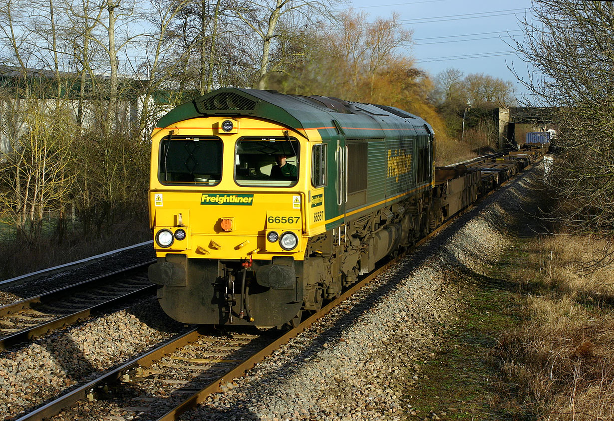 66567 passes Yarnton on 2 February 2008 with the 4O14 01:15 Ditton to Southampton freightliner. Ironically I had seen this same loco only a few weeks before heading the opposite direction with 4E44. In that instance I photographed it from the bridge seen in the background. |