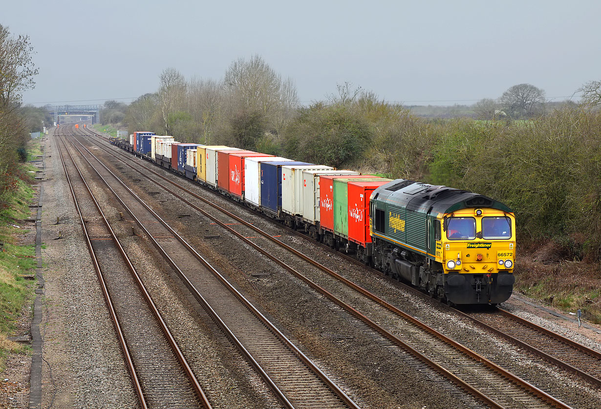 66572 ambles slowly along the up relief line near Grove on 31 March 2014, as it prepares to stop at Wantage Road to allow a following HST to pass. It is working the 4O57 08:13 Wentloog to Southampton freightliner. The loco could certainly do with a repaint. Note the two huge rust patches on the front end! |