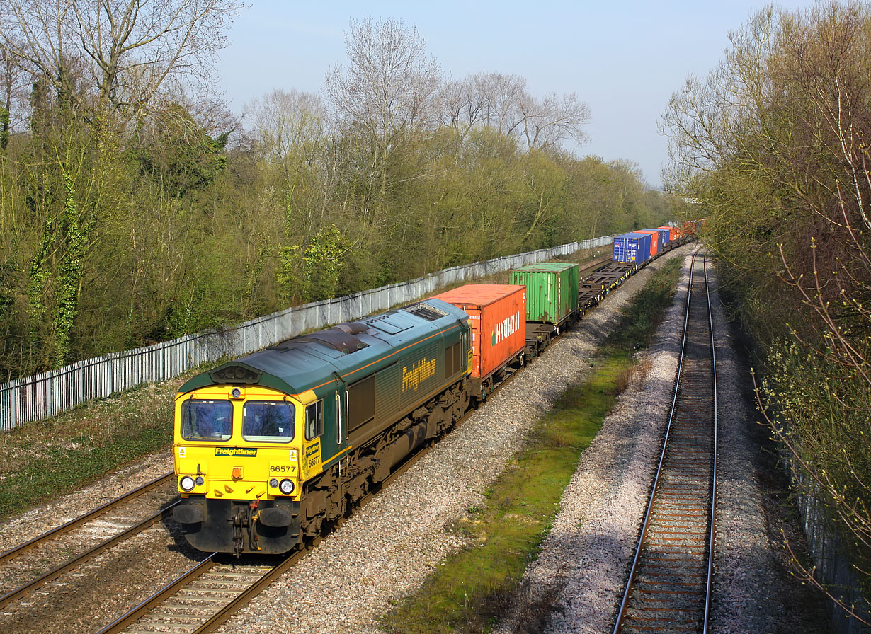 66577 passes Wolvercote with the 4O14 06:39 Birch Coppice to Southampton freightliner on 10 April 2010. It was just starting to slow down here under amber signals, as it was obviously catching up 66178, which had passed just a few minutes before. Two freights within five minutes is unfortunately not an indication of the level of traffic you can expect in the Oxford area on a Saturday! |