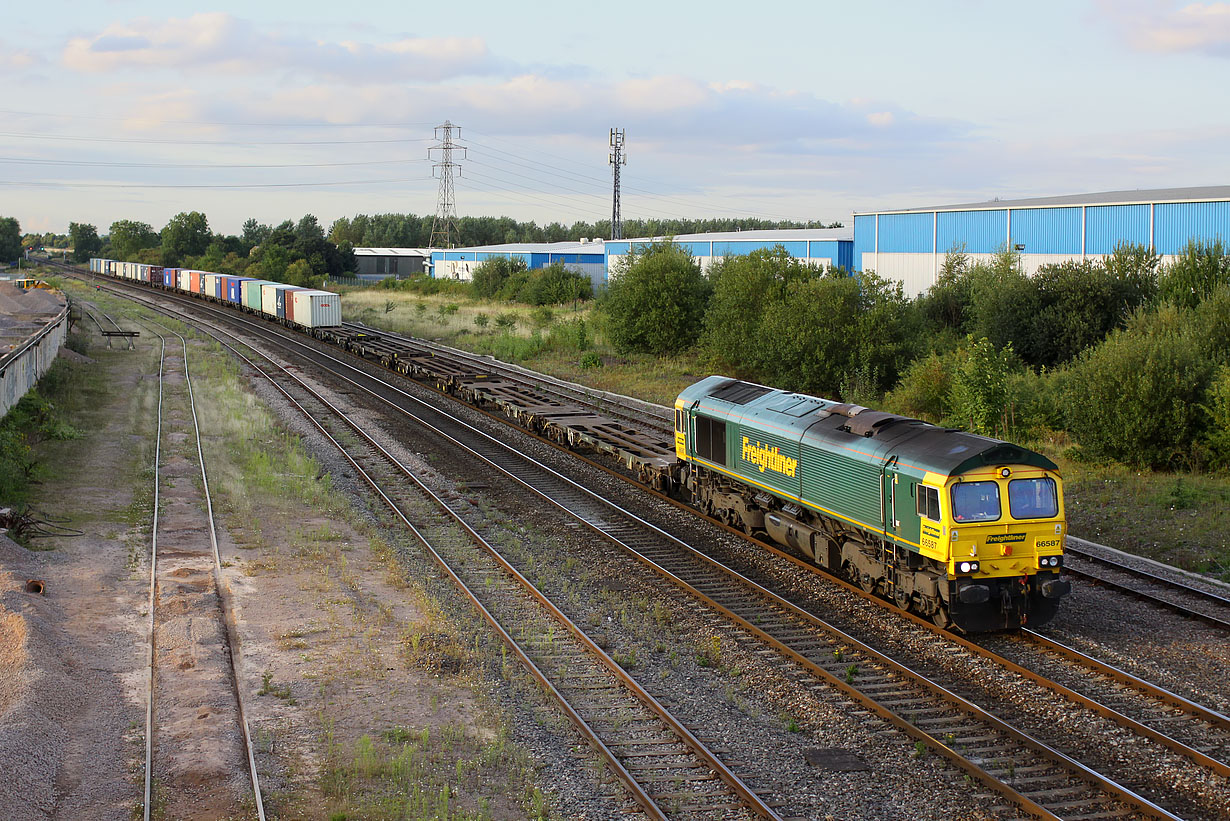 66587 approaches Banbury in the last of the weak evening light on 17 August 2009 with the 4O29 14:38 Trafford Park to Millbrook freightliner. A few more boxes near the front of the train would have made a better picture!