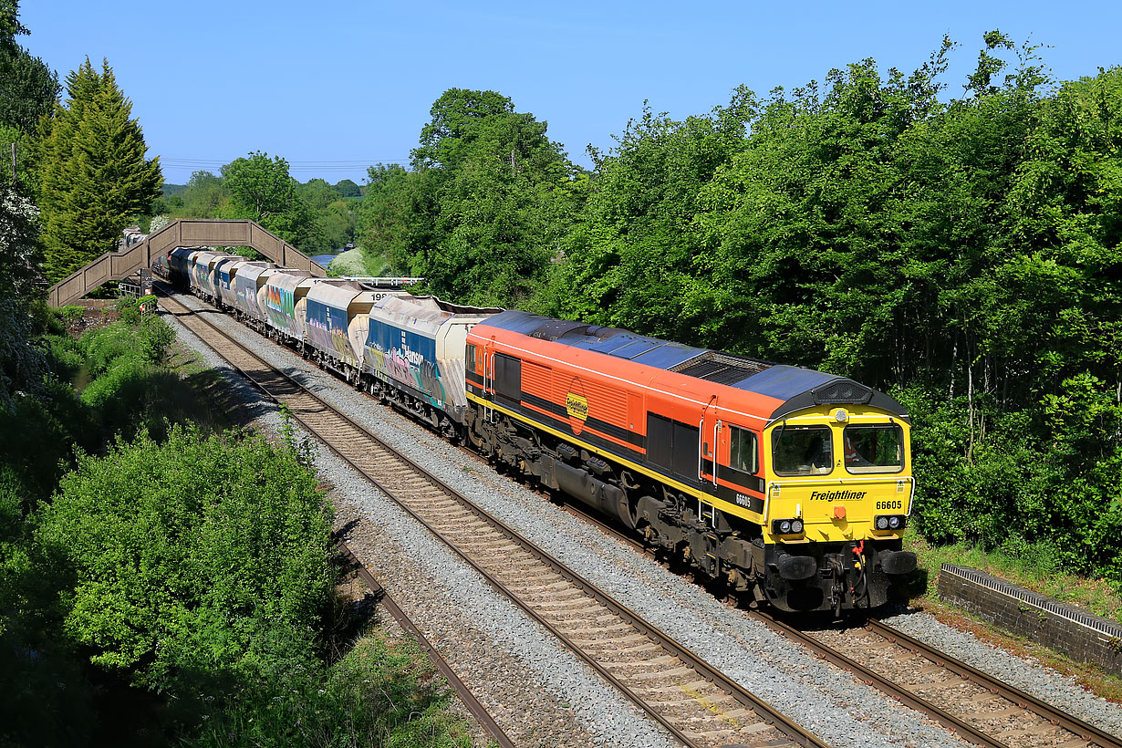66605 passes Little Bedwyn on 26 May 2023 with the 6V18 11:17 Allington to Whatley Quarry stone empties. This was an unexpected bonus. I hadn't checked up on its progress when I arrived at the location, as I assumed it would be long gone. Just as I arrived on the bridge I heard a hoot, and then it came into view, running nearly an hour late. |