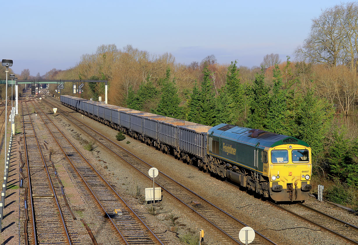 66607 passes Hinksey Yard on 9 January 2025 with the 6V53 10:38 Oxford Banbury Road to Stoke Gifford stone empties. Very head on lighting, but a better sun angle than anywhere else in the Oxford area at that time of day.