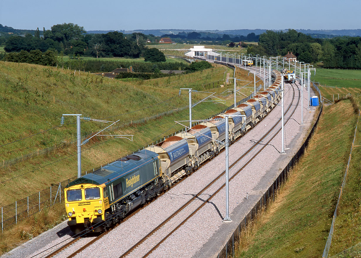66612 brings up the rear of an empty ballast train heading back to Beechbrook Farm along the partially completed Channel Tunnel Rail Link at Calehill Heath (near Charing) on 19 July 2002. 66554 is the lead locomotive, and in a remarkable example of parallel running, it can just been seen keeping pace with Class 20 D8188 on a wiring train, whilst in front of that is a tamper unit. This was just a selection of a whole series of trains that were all heading home after a day's work on the new line. |
