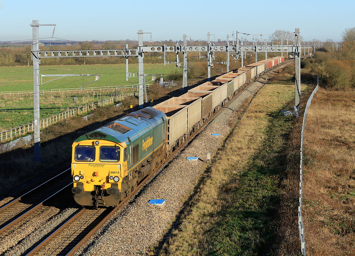66616 passes South Marston on 13 January 2022 with the 6C48 12:49 Appleford to Whatley Quarry stone empties. This had left over an hour early, but sat at Challow until almost its booked time, so was a mere 4 minutes early here. Delays later on in the Westbury area, saw it arrive at its destination over 100 minutes behind time! |