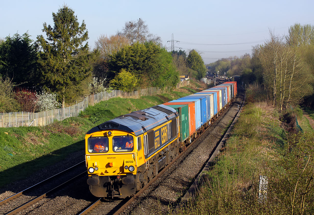 GBRf continues to win traffic from the ailing DB Cargo, and in April 2017 the latest acquisition is the MoD traffic from Bicester. 66722 Sir Edward Watkin is pictured passing Kennington with the inaugural 6O44 08:16 Bicester to Marchwood MoD stores on Monday 3 April 2017. Unlike DB's local locos, 66722 has had to make the long light engine trip from Kent, running as the 0M44 03:20 Tonbridge West Yard to Bicester. |