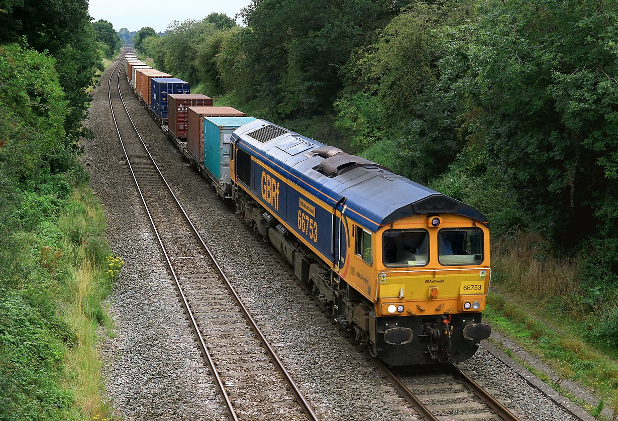 66753 EMD Roberts Road passes Souldern Wharf on 7 August 2020 with the 4M19 11:50 Southampton Western Docks to East Midlands Gateway intermodal. The day had been sunny up until this point, but this would have been impossibly shady and backlit, had the sun still been out. |