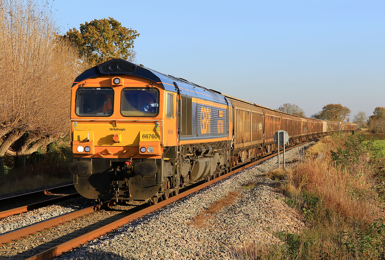 66760 David Gordon Harris approaches Collins Lane level crossing, Purton, on 6 November 2020 with the diverted 6V32 10:23 Tilbury to Trostre Works steel empties. This was being worked top'n'tail with 66779 Evening Star, but unfortunately that was on the rear of the train! |