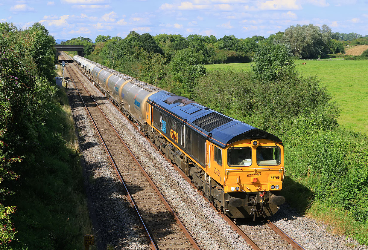 Black liveried 66769 LMA League Managers Association passes Lower Wick on 16 August 2023 with the 6V84 07:38 Clitheroe Castle Cement to Avonmouth Hanson Siding cement tanks. The bridge in the background is the M5 motorway.