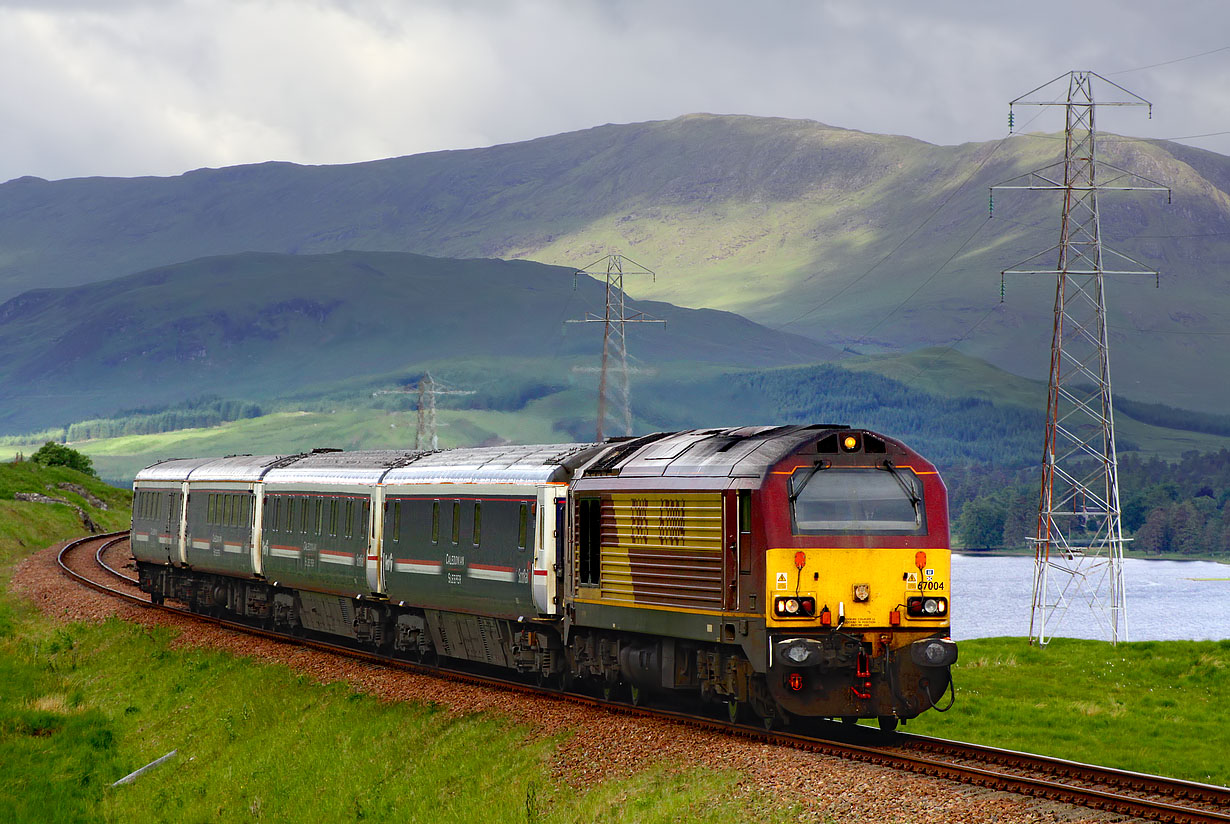 67004 climbs past Achallader on 24 June 2013 with the 1Y11 04:50 Edinburgh to Fort William ScotRail sleeper. Hardly worth the long walk from the car, especially considering that the sun decided to stay behind the clouds at the appropriate time, and certainly no substitute for the sadly missed Class 37s. Loch Tulla is in the background. |