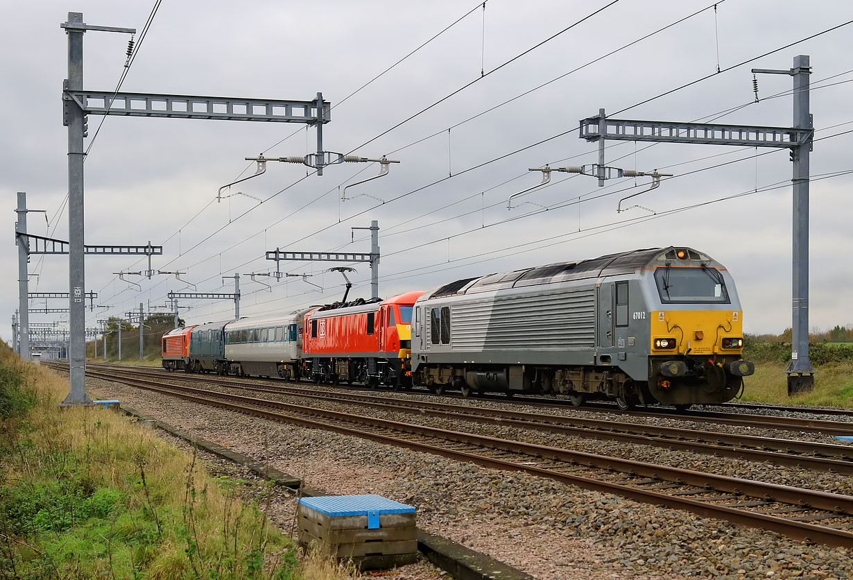 67012 passes Grove in miserable light on 14 November 2019 with the 5Q95 13:59 Swindon Transfer to Didcot Parkway overhead line test train, using ex-works electric loco 90035. Prototype HST liveried Mk 3 11074, DVT 82115 and 67028 make up the rest of the train. What a pity this didn't run the previous day, which was mostly sunny! |