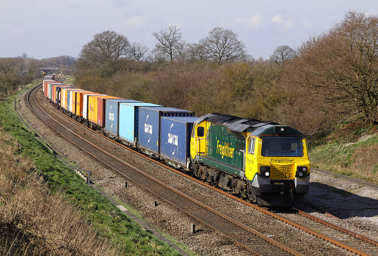 70016 passes Compton Beauchamp on 24 March 2014 with the 4O57 08:13 Wentloog to Southampton freightliner. The biggest change in freight traffic that I have seen over the Swindon to Didcot line since I have been taking photos, is the massive increase in freightliner traffic. Not difficult, as in the 1980s there was virtually none! |