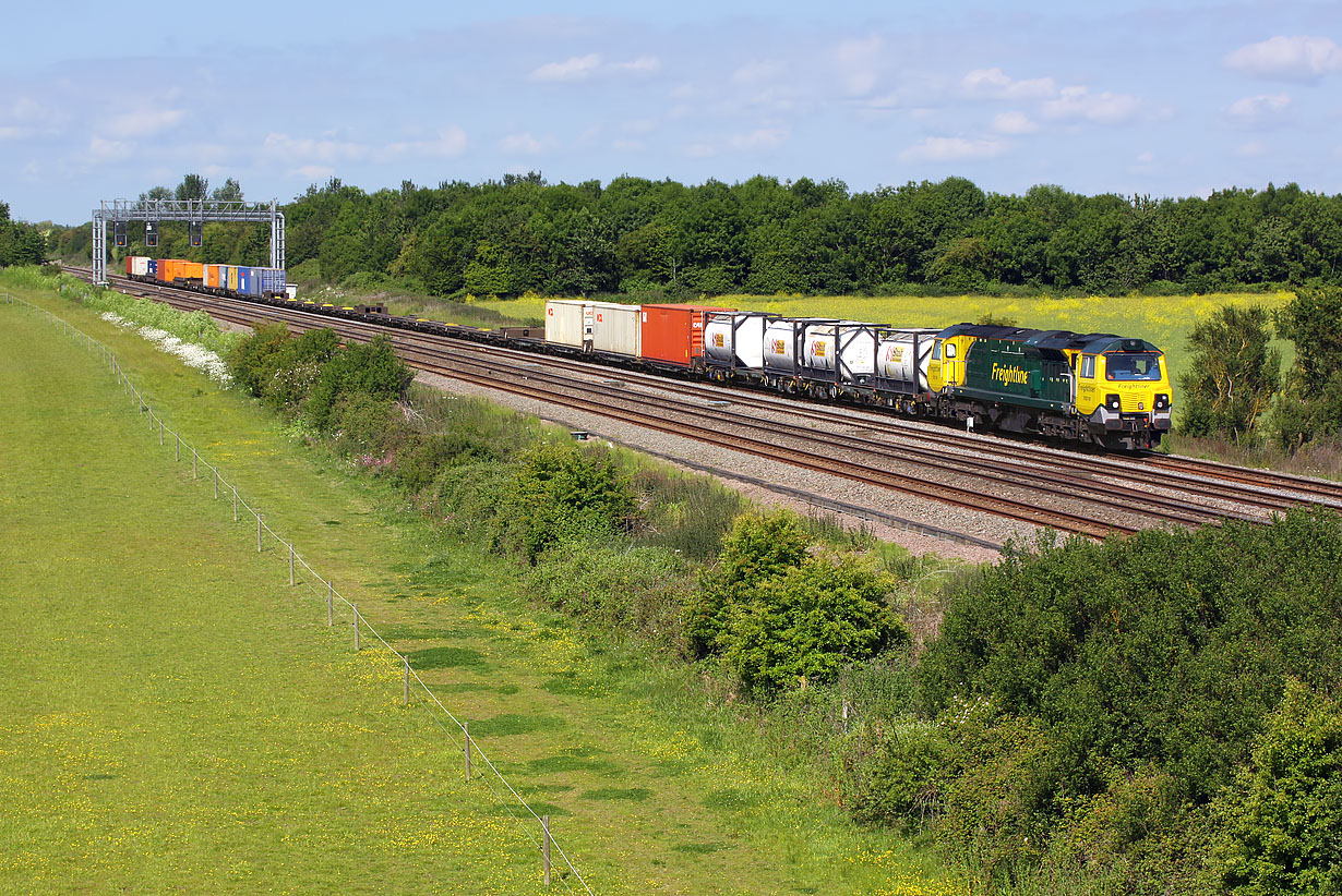 70018 approaches Circourt Bridge, Denchworth, on 8 June 2015 with the 4O59 08:00 Wentloog to Southampton freightliner. Coincidentally I had photographed this same loco, on the same working (albeit on a slightly different schedule), at this very spot a few months earlier. I will leave you to decide which time of year provides the better lighting conditions! |
