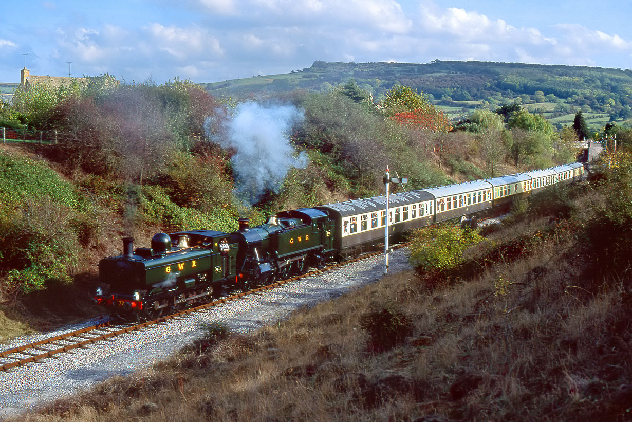 57xx Class 0-6-0PT 7752 & 61xx 2-6-2T 6106 leave Winchcombe on 14 October 1990, en-route from Toddington to Gretton, during the Gloucestershire Warwickshire Railway's Great Western Railway weekend. Although they don't appear to be working too hard here, it was enough to cause a small lineside fire! |