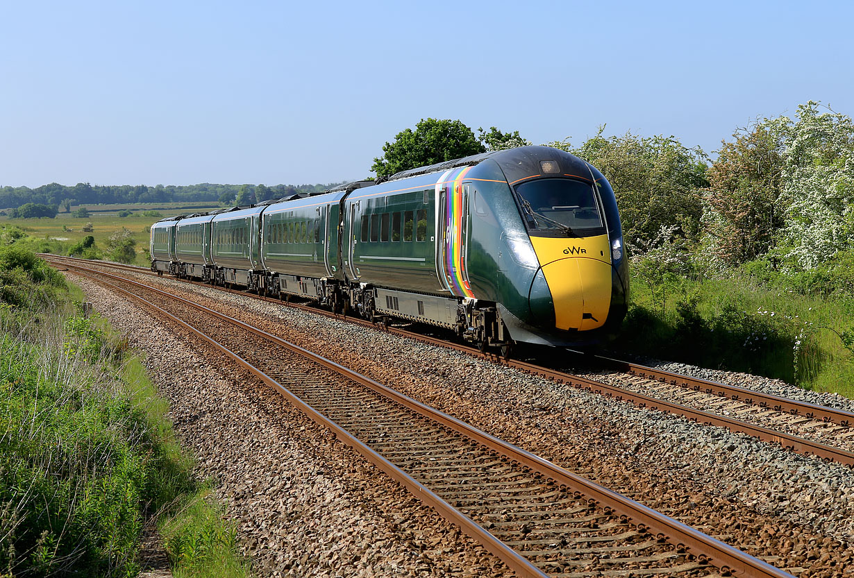800008 passes Coates on 1 June 2023 with the 1L82 16:15 Gloucester to Paddington GWR service. The official source of the River Thames is in a field behind the hawthorn bushes, although for most of the year the actual source is further to the south.