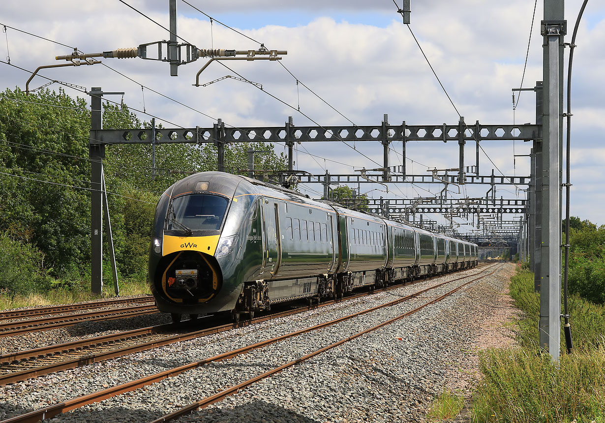 800023 Firefighter Fleur Lombard & 800031 Mazen Salmou approach Circourt Bridge, Denchworth, on 10 August 2023 with the 1B11 10:48 Paddington to Swansea GWR service. Note the severe kink in the down relief line.