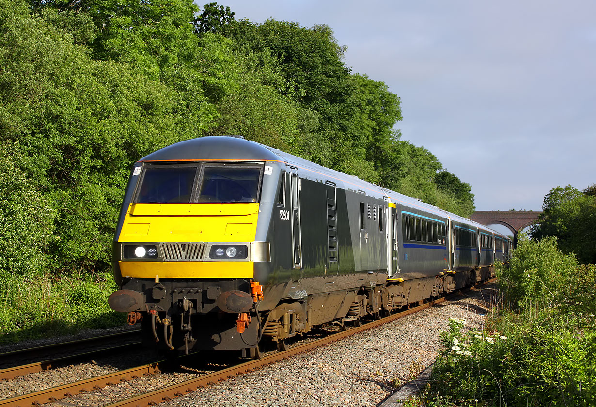 82301 leads the 1F91 06:55 Birmingham Moor Street to Marylebone Chiltern Railways service past Ardley on 25 June 2012. The tall bridge in the background formerly carried the road between Ardley and Upper Heyford. This became nothing more than a farm track after the road was severed by the expansion of Upper Heyford airfield after the Second World War. |