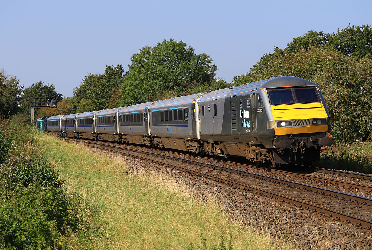 82303 leads the 1H45 12:55 Birmingham Moor Street to Marylebone Chiltern Railways service past Wormleighton Crossing on 21 September 2020, with 68009 Titan doing the pushing at the rear. Luckily there is a good view in both directions at this location. |