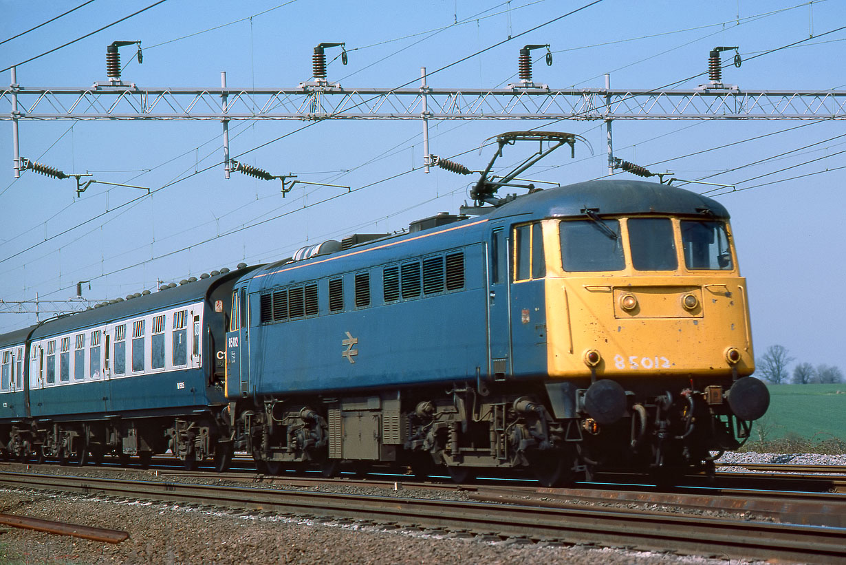A dramatic low level shot of 85012 as it speeds past Soulbury with the 1A39 12:18 Birmingham New Street to Euston service on 24 April 1984. This loco was renumbered 85104 in June 1989 and withdrawn two year later. It was very nearly saved for preservation, literally almost being bought whilst waiting to be cut up at MC Metals, Glasgow. However, when Pete Waterman realised the state the loco was in after it had been partly cannibalised whilst at Crewe, the sale did not go ahead and the loco was scrapped. |