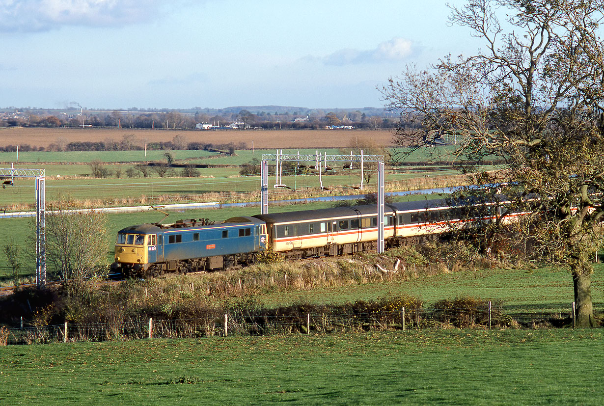 86224 Caledonian speeds through the Northamptonshire countryside near Gayton on 15 November 1986 with the 1H12 14:00 Euston to Manchester Piccadilly InterCity service. Just behind the railway is the Grand Union Canal, which parallels the line for a considerable distance. |