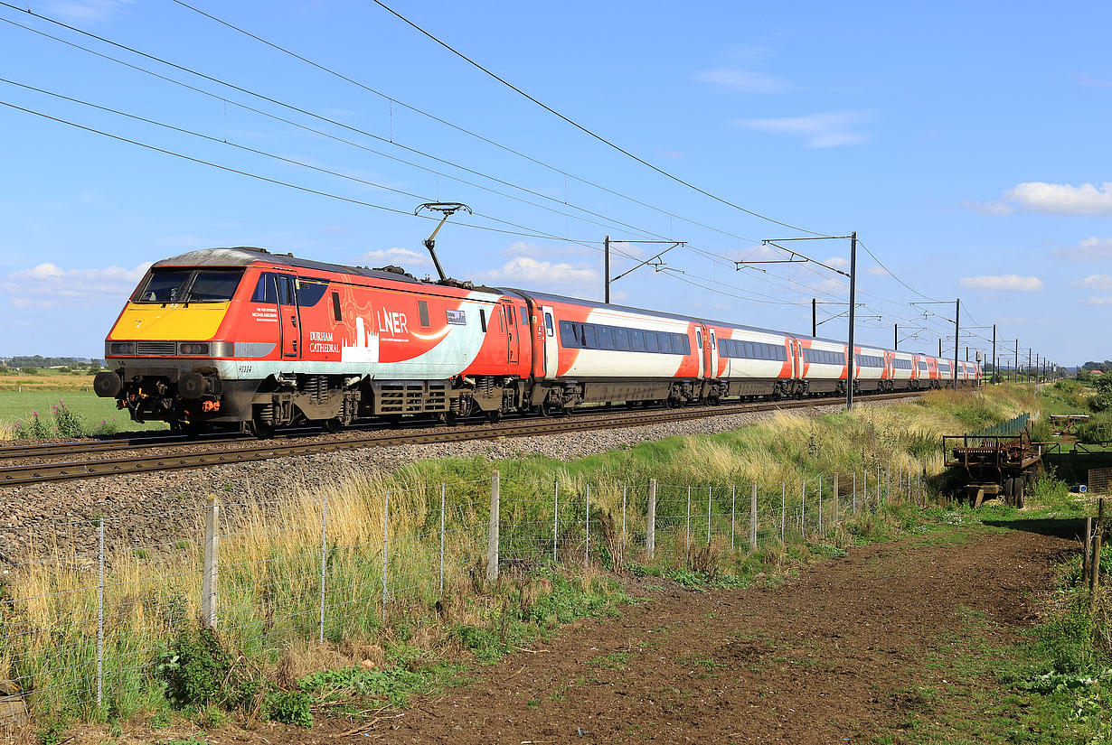 91114 Durham Cathedral brings up the rear of the 1E16 13:00 Edinburgh to Kings Cross LNER service at Balderton Crossing, Claypole, on 22 July 2019. In addition to the nameplate, the loco features bodyside graphics, and underneath the side window, the wording 'The Very Reverend Michael Sadgrove, Dean of Durham 2003-2015'. The dean named the loco in September 2015, upon his retirement. Very nice, I didn't even get a watch! |