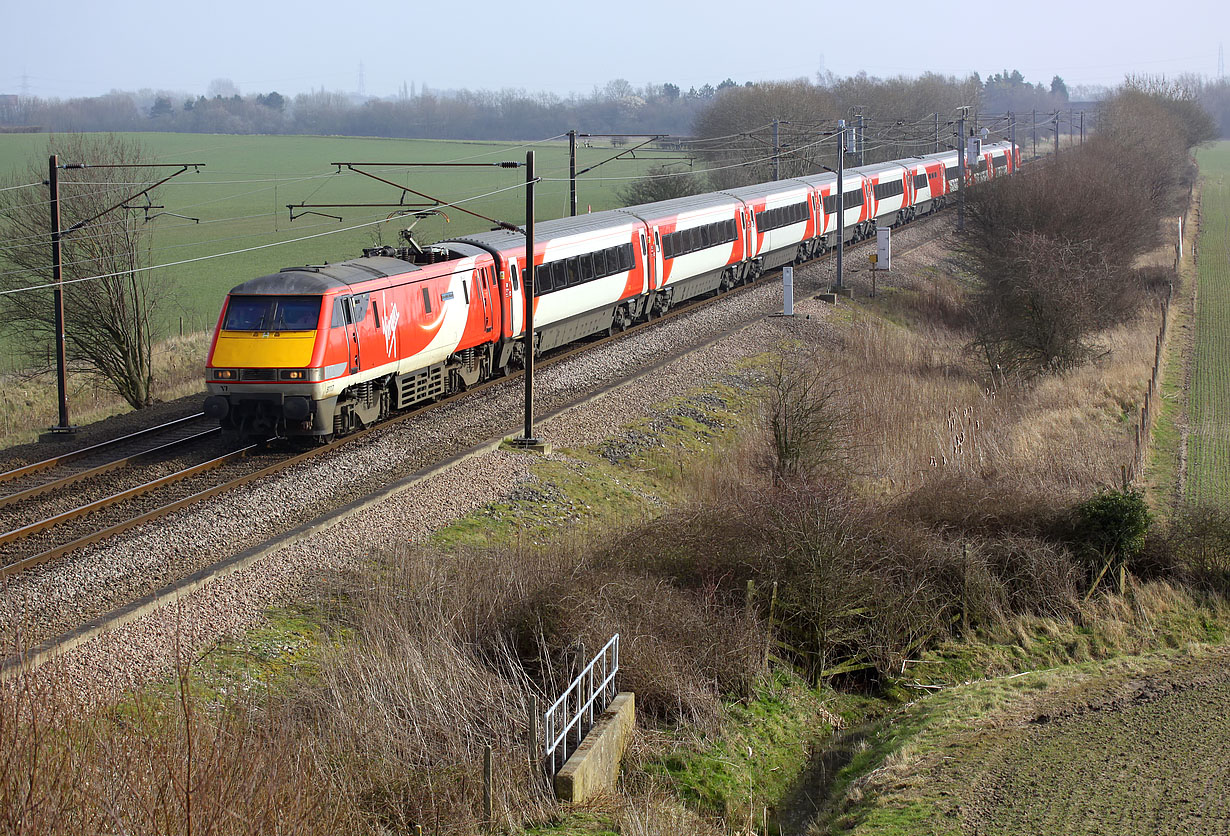 91117 West Riding Limited passes Burn on 13 March 2016 with the 1S17 12:20 Kings Cross to Edinburgh Virgin East Coast service. This was one of those days when high pressure resulted in a sunny afternoon, but with increasingly hazy conditions, with the sun eventually fading out into the thin cloud. |