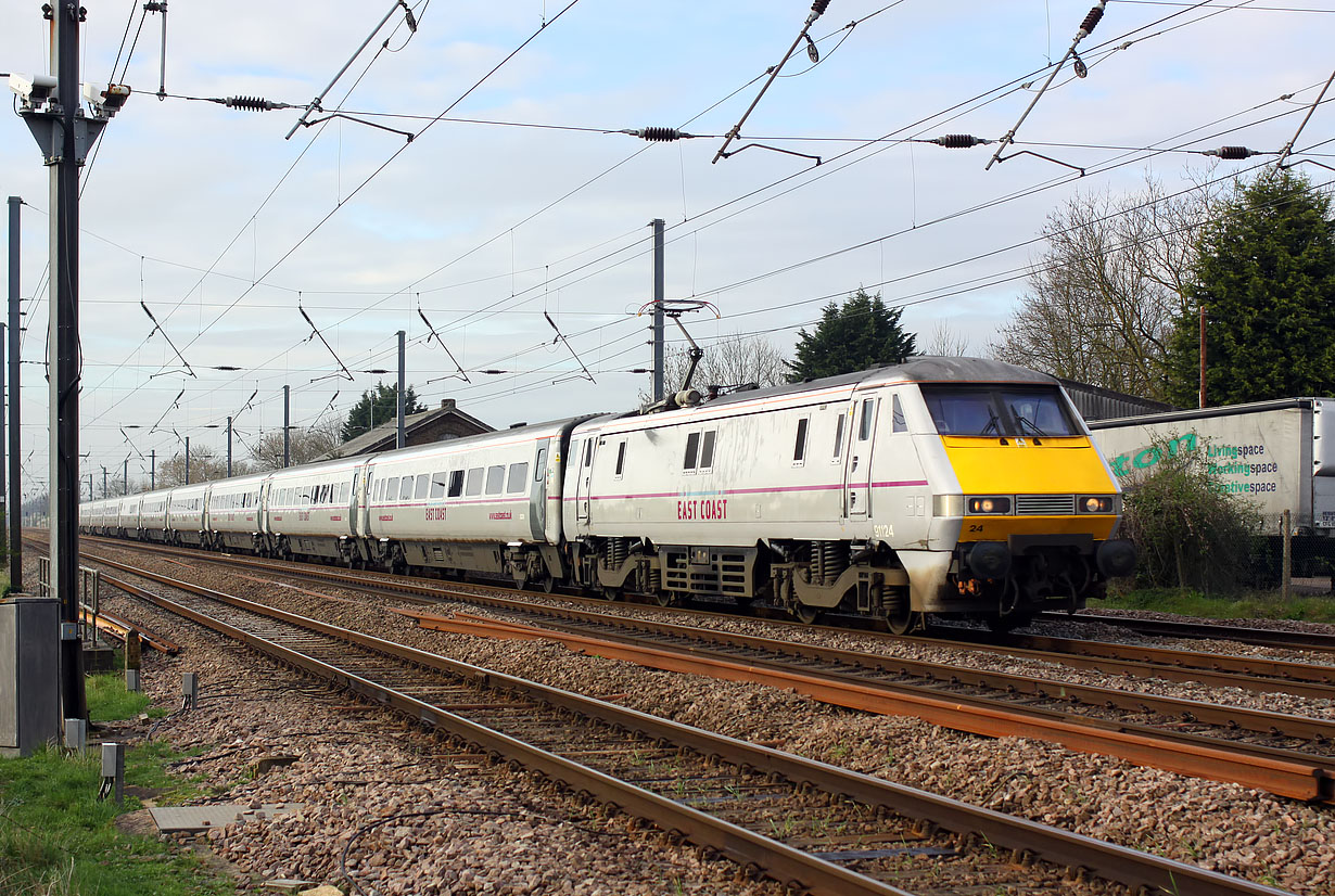 91124 speeds past Tempsford on 5 April 2014 with the 1D05 08:03 Kings Cross to Leeds East Coast service. Photo taken from a very quiet level crossing, leading only to nearby farms. Note the cameras on the post on the left.