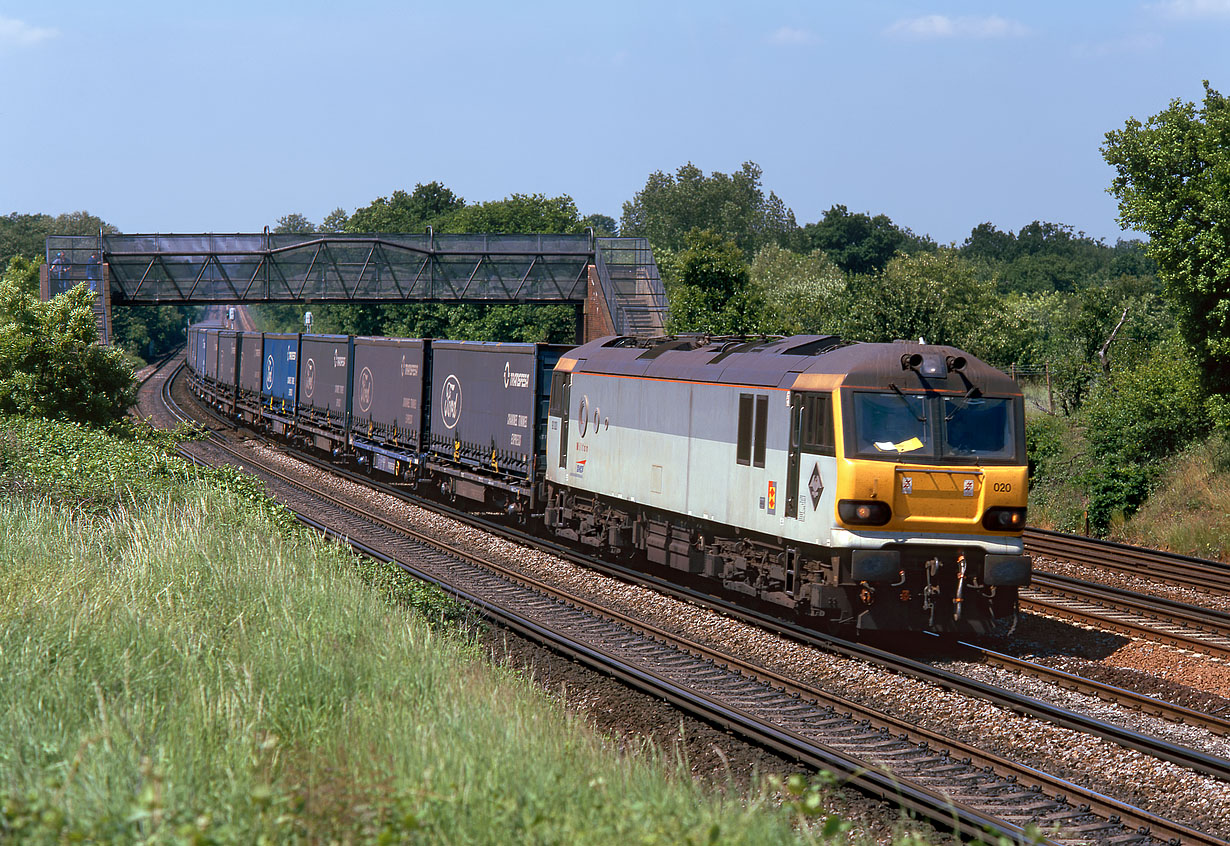 92020 Milton passes Swanley on 30 May 1998 with the 7O56 09:18 Wembley to Dollands Moor Ford Transfesa car components 'Blue Train'. This will later form the 4254 14:09 Dollands Moor to Silla train via the Channel Tunnel. Note the extremley photographer unfriendly footbridge in the background, which when this picture was taken had just been encased in a mesh screen in effort to deter the local vandals. Luckily there are still several alternative vantage points in the area. |