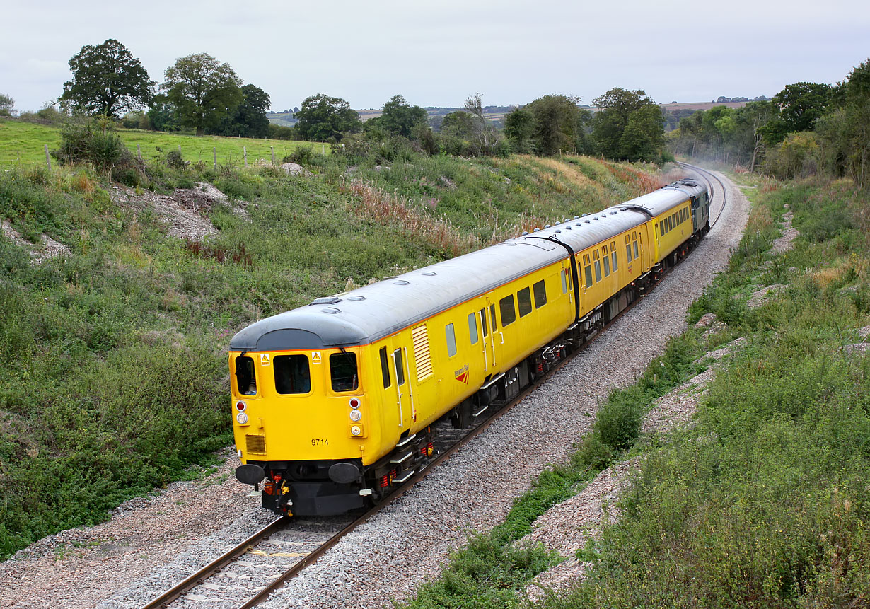Network Rail DBSO 9714 leads the 4Z10 07:50 Derby RTC to Bristol Kingsland Road (via Oxford) test train past Shorthampton on 23 September 2009. 31106 is providing the power at the rear. The recently cleared cutting at this location now makes an excellent photographic location, and as the light was abysmal, I decided to go for a different viewpoint by shooting from the north side. The tiny Norman church at Shorthampton, famous for its Medieval wall paintings, is just out of the picture to the left, a couple of fields from the railway. |