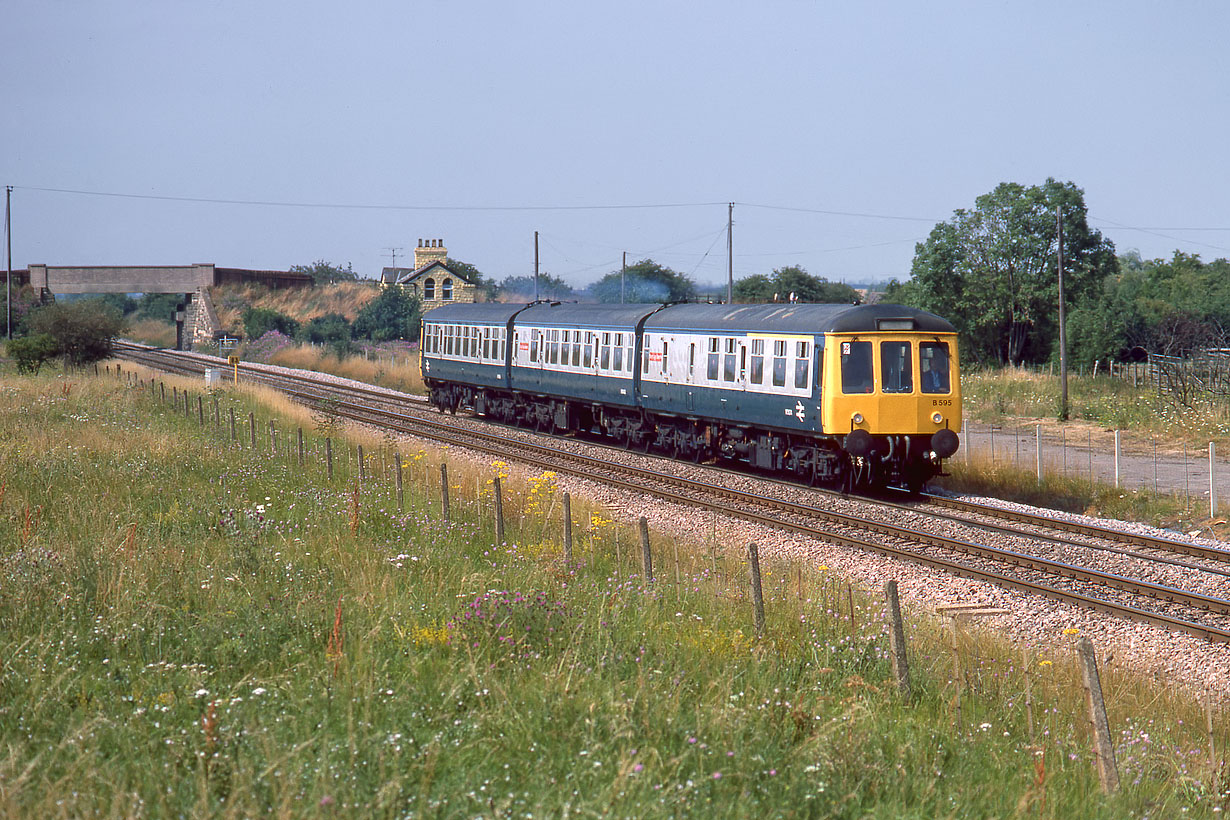 B595 (51074, 59430, & 51086) passes Stoke Orchard with the 15:21 Worcester Shrub Hill to Bristol Temple Meads service on 21 July 1984. Note the two red signs on the two leading vehicles indicating the extended luggage capacity of these cross country units. Although actually nearer to the village of Stoke Orchard than Bishops Cleeve, this is the site of Cleeve station (so called to avoid confusion with Bishops Cleeve station on the Cheltenham to Stratford line). |