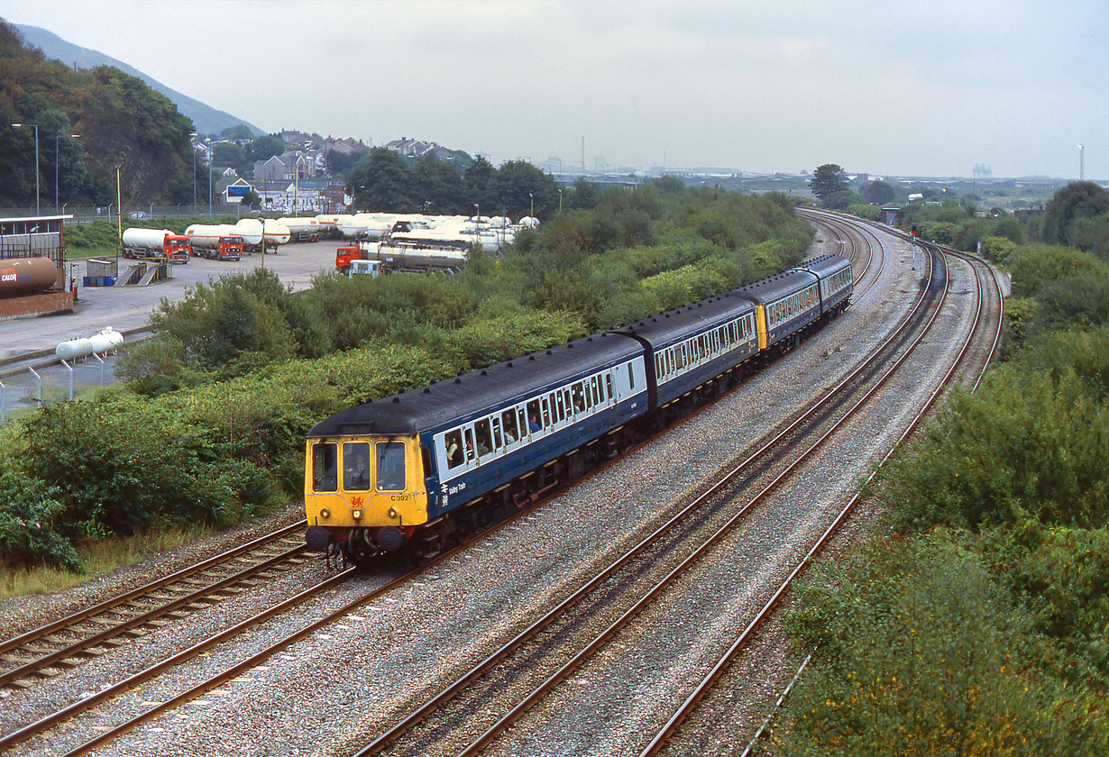 This is not quite the mundane DMU picture that it appears to be. The fact that there is no headboard gives no clue that this in fact the Monmouthshire Railway Society 'DMU Demise' railtour, pictured approaching Briton Ferry on 26 September 1992. The train had already visited the Ford engine plant at Bridgend, and was now heading for Onllwyn. C392 (51134 & 51147) & C395 (51133 & 51140) have the honour of celebrating the end of first generation DMU operations in South Wales. The LPG depot in the background is now a car auction site. |