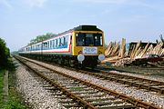 L403 (51378, 59488 & 51336) passes the then recently built Foundation Park industrial estate, White Waltham, on 6 January 1991 with the 2A42 11:15 Reading to Paddington Network SouthEast service. After L403 was displaced from the Thames Valley duties in late 1992, it was reformed as two car unit L708. |
