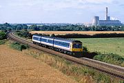 With Didcot Power Station dominating the background, L403 (51378, 59488 & 51336) approaches Culham on 2 August 1991 with the 2C26 09:00 Reading to Oxford Network SouthEast service. The power station was closed in 2013, and has now been demolished. |