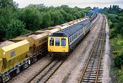54283 (283) is propelled by 55031 (131) towards Oxford on 25 June 1988 whilst working the 07:58 Banbury to Oxford service. They are pictured approaching Oxford North Junction with the up relief line (which runs from Wolvercote to Oxford) prominent in the foreground. Although both vehicles carry Network SouthEast livery, note the slight differences in livery between them, with slightly different widths to the grey bands and what appears to be a red rather than orange cantrail stripe on 54283. While in common with most Class 121 DMBS vehicles 55031 survives in departmental use, unfortunately the same cannot be said of 54283, which like most of the DTS vehicles has since been cut up, in this case at Gwent Demolition at Margam in 1992. |