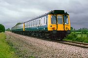 Heritage DMU versatility. 55029 (L129) brings up the rear of the 2B50 06:04 Reading to Worcester Foregate Street service at Lyneham on 19 May 1986. It is deputising for the DMBS vehicle out of Class 117 unit B435, the other vehicles of which are 59486 & 51415. |