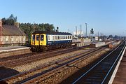 55029 (L129) & two thirds of Class 117 set L425 (59515 & 51405) accelerate away from Langley station on 6 November 1986 with the 2F43 14:34 Paddington to Reading Network SouthEast service. The practice of replacing a Class 117 DMBS vehicle with a bubble car was standard practice when required, and demonstrates the versatility of the blue square multiple working system. |