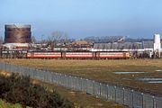 An unusual, and unrepeatable view of the railway at Goole, taken on 13 March 1999. 144019 passes Potters Grange Junction with the 08:49 Hull to Sheffield Arriva Trains Northern service. This view cannot be repeated today, not only because of tree growth in the foreground, but also because an industrial estate has appeared on the muddy field in the foreground. Surprisingly, the gas holder in the background is still in existence. |