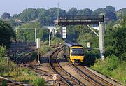 165103 passes the south end of Hinksey Yard on 11 August 2018 with the 2V21 09:09 Banbury to Didcot Parkway GWR service. The signal gantry is a recent addition, part of the Oxford area resignalling programme. |