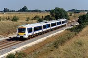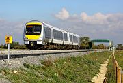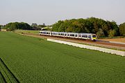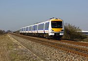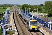 168325 runs parallel with the new concrete road that leads to Holts Farm, near Charlton-on-Otmoor. It is working the 1T50 17:18 Marylebone to Oxford Parkway Chiltern Railways service. The date is 5 May 2016, just a few months into the upgraded line's operation, and before the newly planted trees alongside the fence have started to grow! |