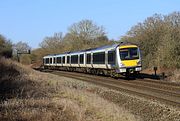 A conveniently sized gap in the lineside bushes allows this excellent view of 168218, as it approaches Ardley Tunnel on 11 February 2008 with the 12:12 Birmingham Snow Hill to Marylebone Chiltern Railways service. |