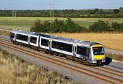 168324 passes Langford Lane, near Wendlebury, on 17 September 2017 with the 1T21 10:05 Marylebone to Oxford Chiltern Railways service. This picture is taken from a recently constructed roadbridge, which a replaces a level crossing a little further to the north. |
