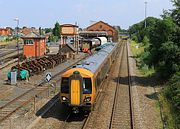 172339 leaves Kidderminster station on 22 July 2021 with the 5D28 11:05 Kidderminster to Kidderminster (via the Down Goods Loop) ECS. This was running 16 minutes late, after arriving late with the 2K25 09:26 West Midlands Railway service from Stratford-upon-Avon. |