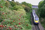 180103 passes Grintleyhill Bridge, Combe, on 14 June 2017 with the 1P40 09:58 Great Malvern to Paddington GWR service. This is just about the worst time of year, and certainly the worst time of day for photography, as is amply proved by the picture of the same unit, with the same train, two months earlier. |