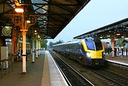 180104 leaves Moreton-in-Marsh station on 6 July 2017 with the 1P35 08:39 Worcester Shrub Hill to Paddington GWR service. This would normally have started from Worcester Foregate Street at 08:26, but was altered as the unit's inbound working, the 1W12 05:47 departure from Paddington, was running 15 minutes late. Note the signal on the left, which allows up trains which are booked to start at Moreton to leave from the down platform. |