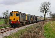 While the Pathfinder Tours 1Z21 Ipswich to Cambridge via Leiston 'Twenty Twenty Vision' participants were enjoying a photo stop at Saxmundham on 10 March 2007, I was searching for a location south of the town, after having seen the tour on the Leiston branch. Every location I looked at was shaded by bushes or trees, and in two cases were down such narrow lanes, that I had to reverse back out to the main road! With time running out I settled on this spot in a field near Campsey Ash, although the sun was much more head on than I would have liked. 20313 is seen here leading sister locos 20315 & 20314. It was only on the way back to the car that I saw where the footpath was, not at all straight across the ploughed field which was the shortest route from the village! |
