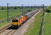 Running a staggering 151 minutes late, 20311 & 20314 pass Thrupp on 14 May 2020 with the 5O86 10:40 (13:03 actual) Leicester to Eastleigh Arlington barrier move. This late running was very fortunate, as at the correct time the lighting would have been straight down the track, and totally useless. Also, I was elsewhere at the time, and hadn't taken any notice of this working. Only the timely text from a friend allowed me to go out again, just after I had arrived home. |